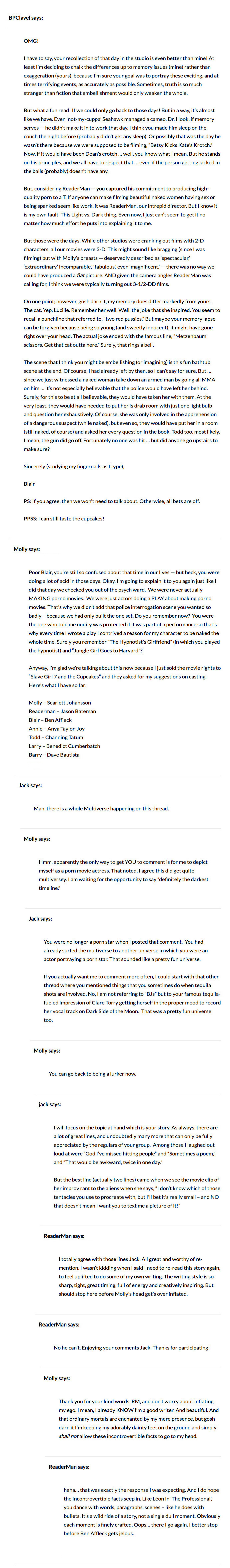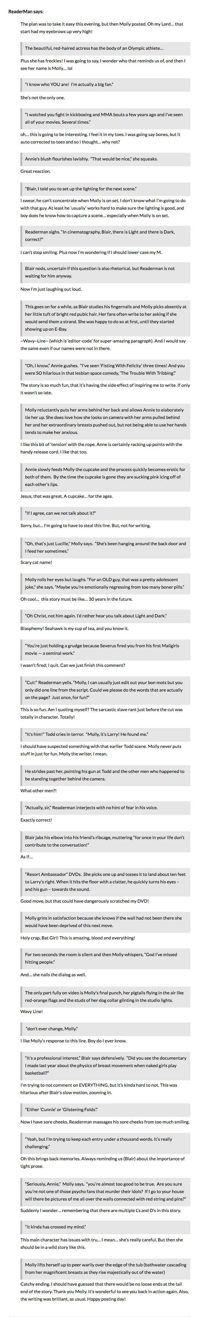 "Cut!" Readerman yells. "Molly, I can usually just edit out your bon mots but you only did one line from the script. Could we please do the words that are actually on the page? Just once, for fun?"