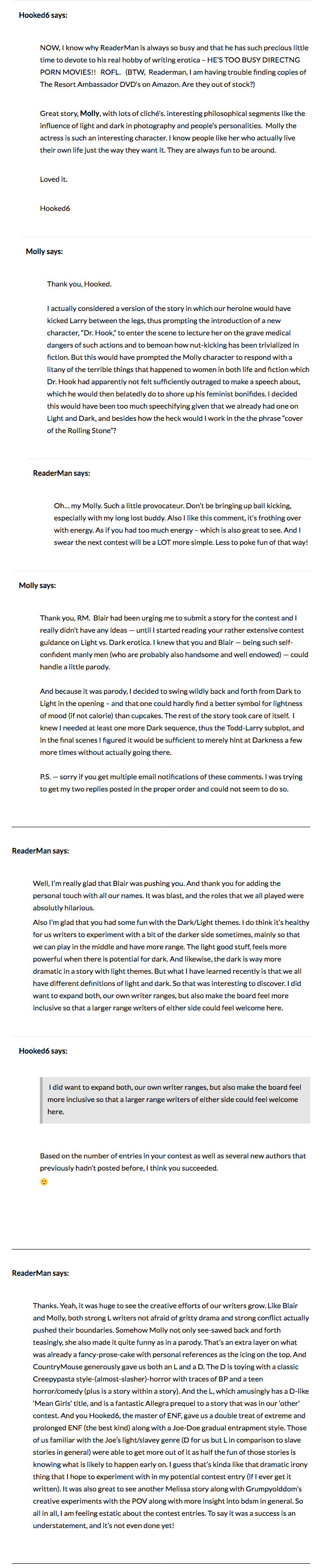 This was the original kernel of my idea for the story -- lampooning Readerman's long-winded explanation of 'dark' versus 'light' erotica in the contest description.