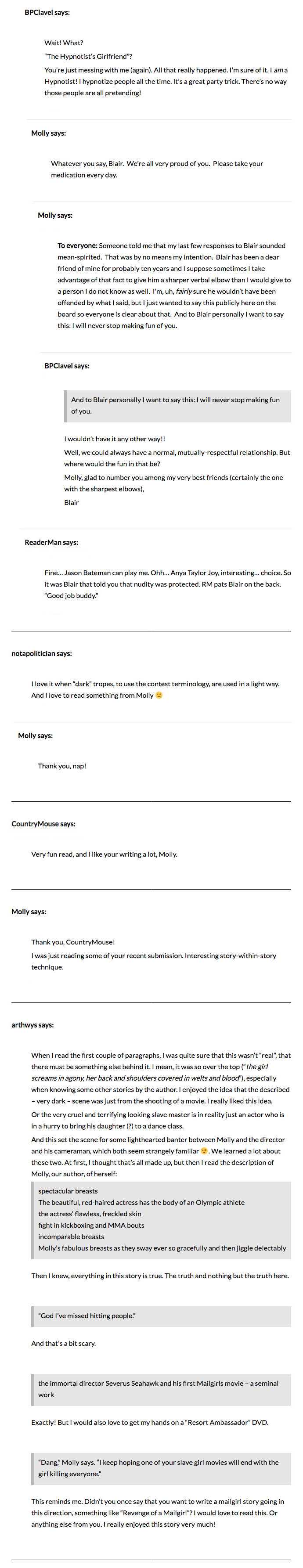 "Seahawk" was another writer in the group, whose stories I disliked because they were about "mailgirls," who were basically naked girls in a corporate setting who ran through offices delivering messages. That aspect would have been fine, but as "slave girls," they constantly had to show servile obeisance to their male overlords -- sometimes even being led on a dog leash.