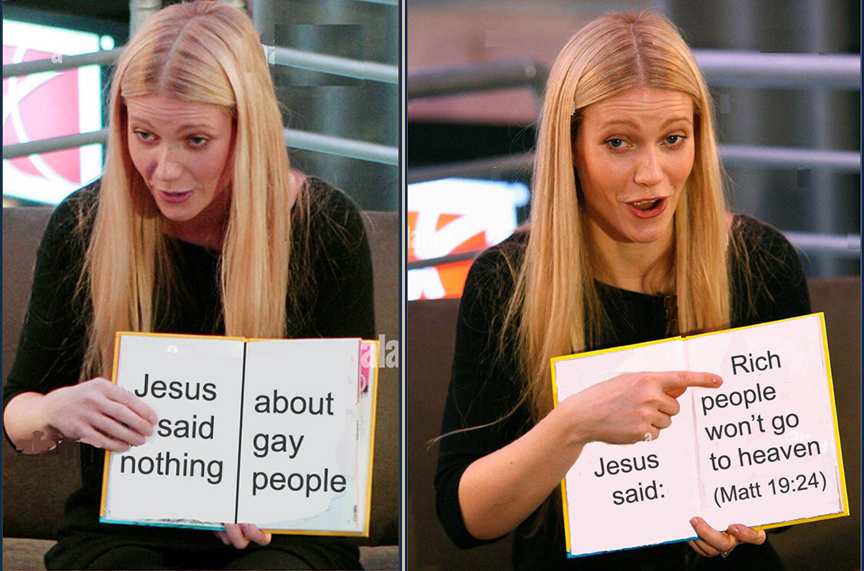 Today is a GiftI have a lot of little things taped to the frame of my computer monitor. In fact I have lots of little things I cut out stuck all over the house. I have a whole wall here in my special room where I have made a collage of cool faces I cut out of magazines. This is "my" room in the house where I have my computer and my art desk and all my goofy arty stuff. Mona never touches any of it and she is so respectful of every little scrap because she knows I have a Reason for everything in this room. But anyways, the particular thing taped to my computer that I was gonna mention says this: "Today is a Gift - What will you do with it?" That is just something I wrote down one day and taped to my monitor. Uh, but I also wrote down and taped up here “You have no idea how head my full is!” But seriously, I am almost constantly aware of the Gift of Today. From talking to other people I realize this is not all that common. People are busy with their jobs and their errands and so on and forget to Be Here Now. It has become cliche, I know, but as a modern-day person trying to talk about theology has said, "all the good words are taken." What the Bible says about homosexualityWell, heck, anyone knows that, right? The Bible sez we're "an abomination." In several places. Interestingly, though, there are a LOT of other things in the Bible that most Christians ignore. For example, some people love to quote Leviticus 18:22 about homosexuality but they ignore the entire rest of the book which prohibits having tattoos, eating pork and shellfish, the wearing of a garment made of two types of cloth, planting two types of seed in the same field and dozens of other things that modern-day Christians ignore. Leviticus also explains in great detail how to buy and sell slaves in a manner that clearly does not condemn slavery. (Leviticus 25:44-46) Granted, there are a couple of anti-gay passages are in the New Testament also, mostly in the letters of Paul, who was a busybody with an opinion about EVERYthing. But he issued edicts and orders on a lot of other things that Christians choose to ignore. For example, in I Corinthians 11:5-6 Paul says women must cover their headsin church and never cut their hair. And then a few chapters later, in I Corinthians 14: 34-35, Paul writes: "Women are to remain quiet in the assemblies, since they have no permission to speak: theirs is a subordinate part, as the Law itself says. If there isanything they want to know, they should ask their husbands at home: it isshameful for a woman to speak in the assembly." Most Christian women don't keep their mouths shut in church -- and I'm certainly not saying they should. But if they're gonna harp to me about what the Bible says about gays, then they'd best shut their traps in church cause the Bible says that too. You'd think that people who consider Jesus their Lord and personal savior would value HIS words above all others -- and in many Bibles the words of Jesus are illuminated in red. In those red letters, Jesus himself is never quoted saying anything against homosexuality, but he is loud and clear about divorce for example. In Matthew 5:32 Jesus says "whosoever shall marry her that is divorced committeth adultery." Most Protestant churches accept divorce and re-marriage and you never hear them pointing to this passage and condemning divorce. Yet they sure like those anti-gay sections. He is also pretty explicit on the topic of wealth and is quoted in three separate gospels saying "it is easier for a camel to pass through the eye of a needle than for a rich man to enter the Kingdom of God." (Matthew 19:24, Mark 10:25, Luke 18:25) Here is a little parable that I made up to illustrate the hypocrisy of conservative Christians on these topics:
